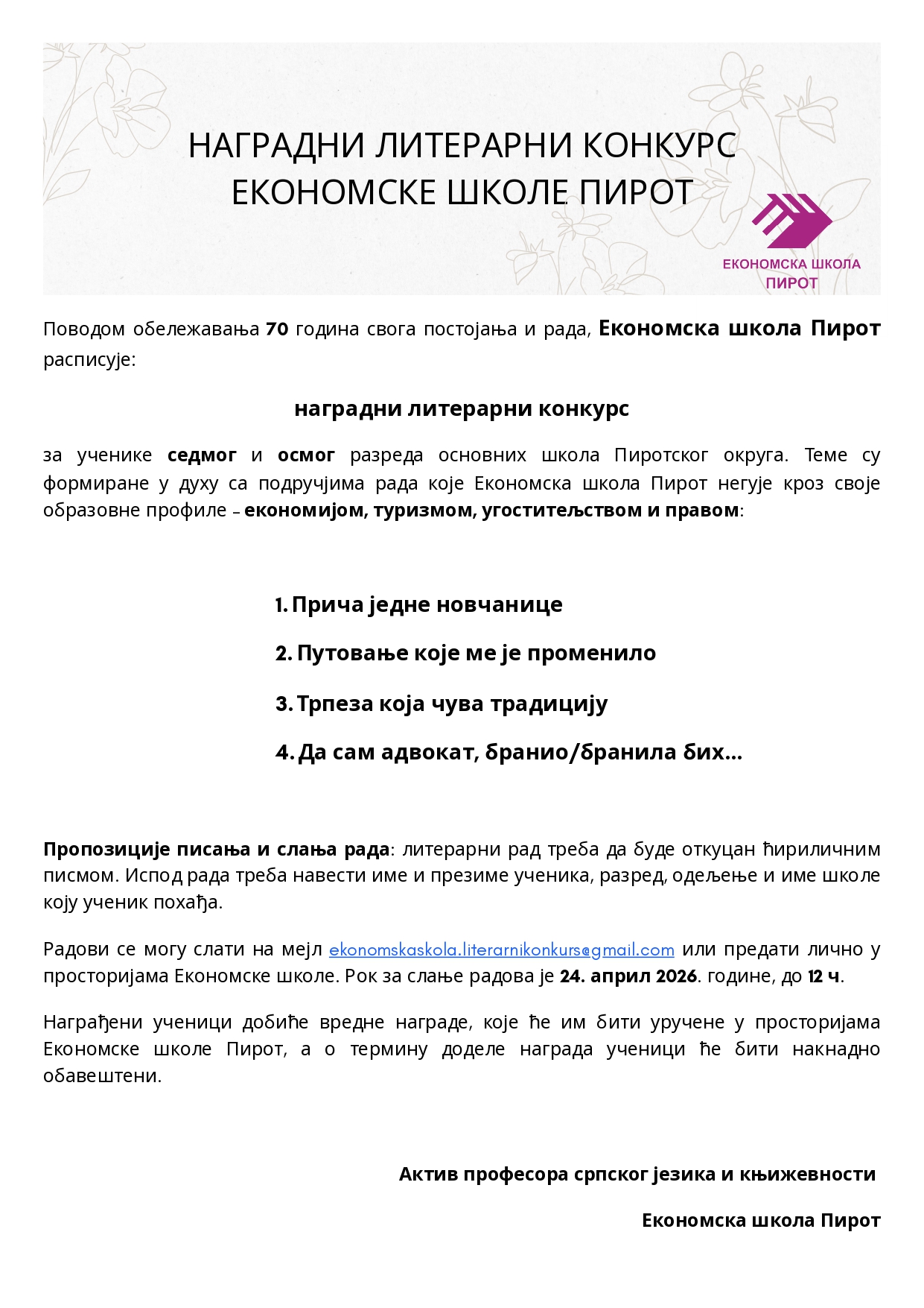 Поводом обележавања 70 година свога постојања и рада, Економска школа Пирот расписује наградни литерарни конкурс за ученике седмог и осмог разреда основних школа Пиротског округа. Теме су формиране у духу са подручјима рада које Економска школа Пирот негује кроз своје