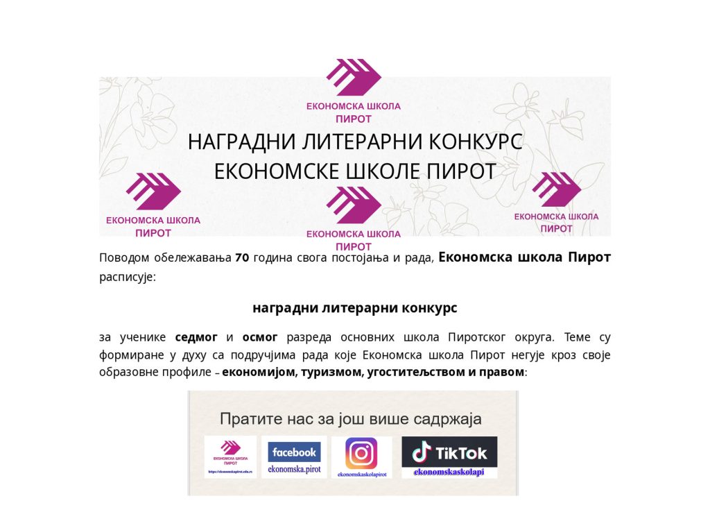 Поводом обележавања 70 година свога постојања и рада, Економска школа Пирот расписује наградни литерарни конкурс за ученике седмог и осмог разреда основних школа Пиротског округа. Теме су формиране у духу са подручјима рада које Економска школа Пирот негује кроз своје