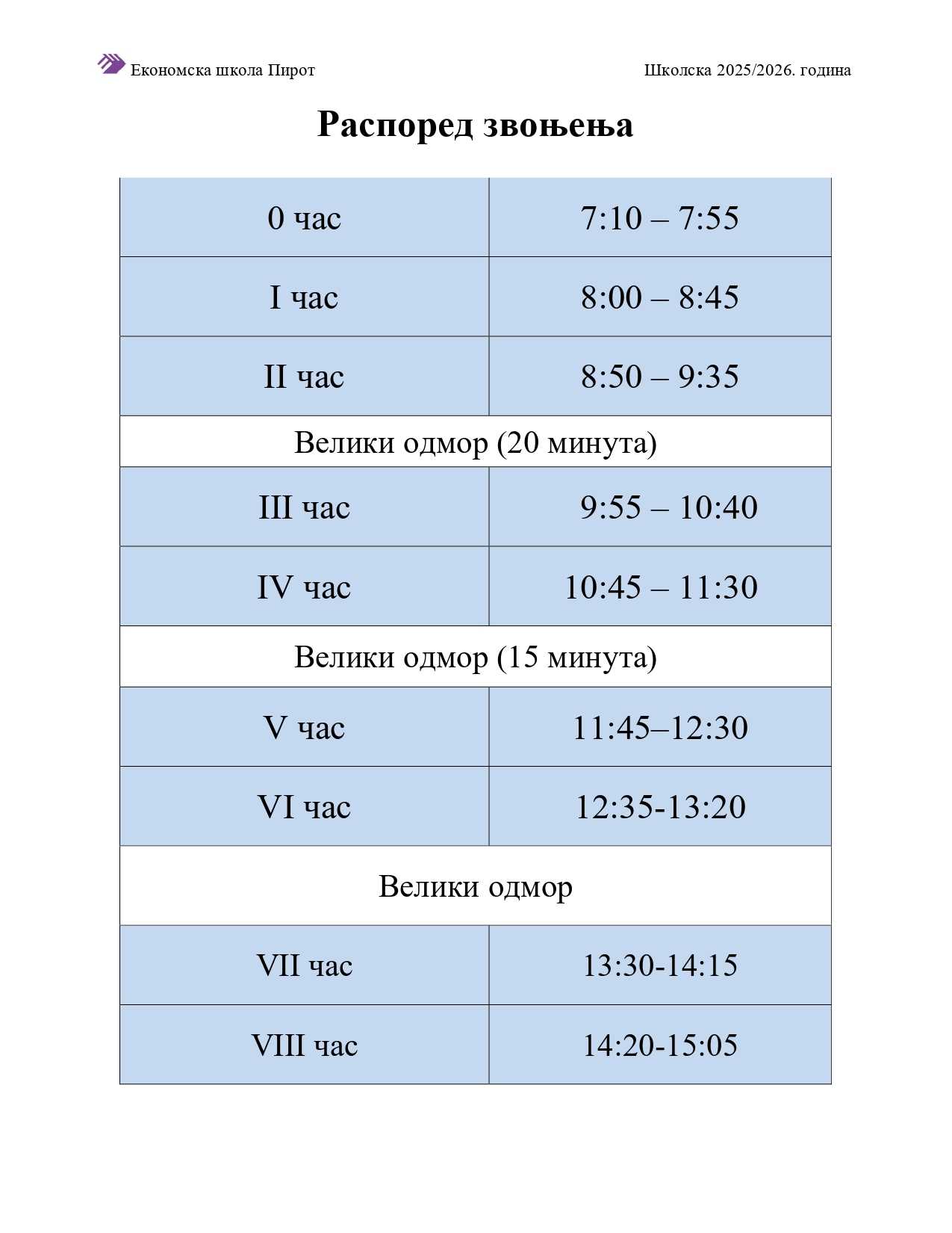 Радно време Економске школе Пирот је од 07:00 до 15:00 часова радним даном.